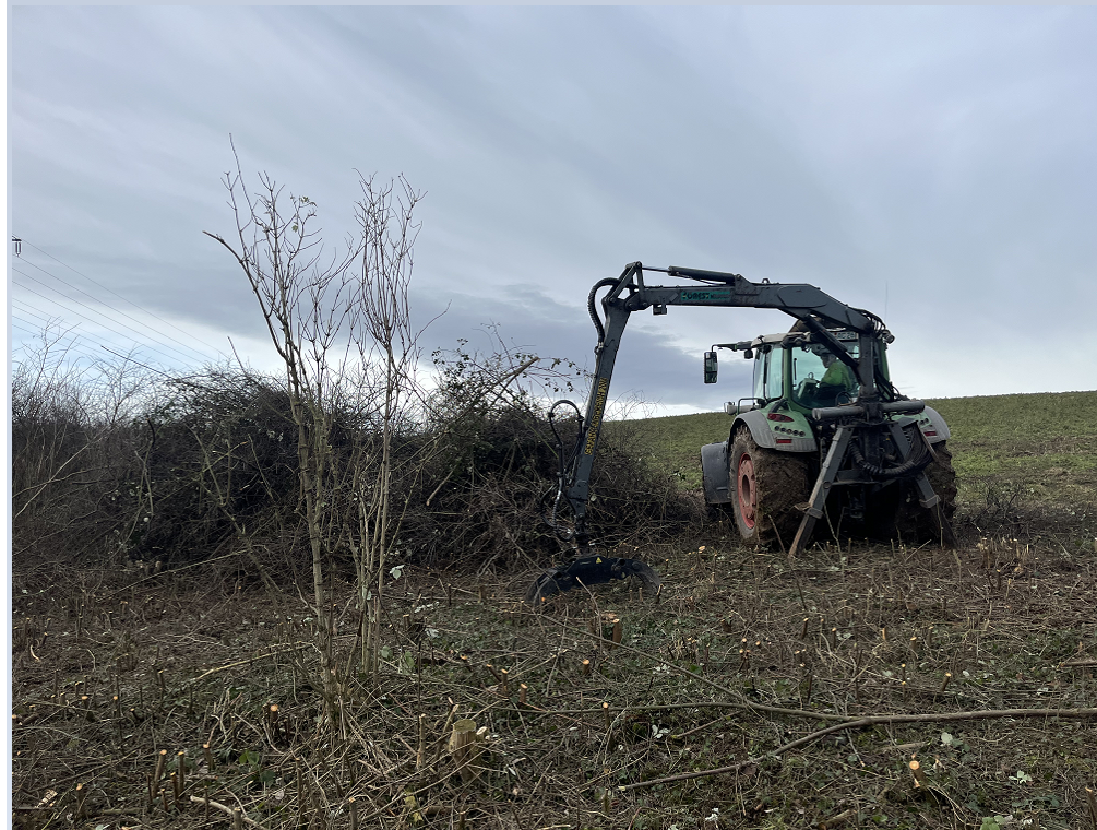 2.) fertiger Feldheckenabschnitt, einzelne Elemente der Hecke wurden zu Strukturverbesserung belassen (im Hintergrund noch vollständige Hecke, Abschnitt zwei für Folgejahr